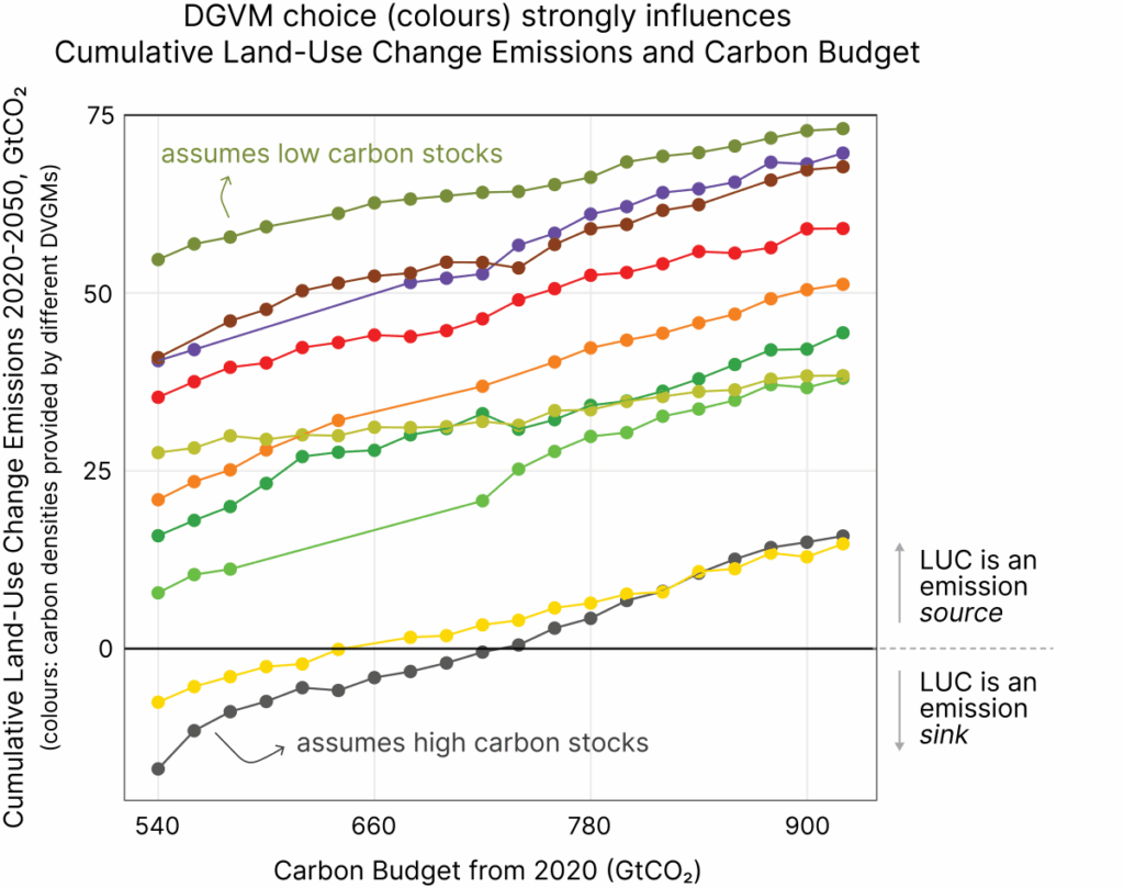 DGVM choice strongly influences cumulative land-use change emissions from 2020. Each colour represents the cumulative LUC emissions 2020-2050 in scenarios that keep total CO2 emissions under a range of carbon budgets from 2020, based on the carbon density values provided by each of the 10 different DGVMs considered. Depending on the DGVM considered, LUC can be either a large emission source or a weak sink, even for very stringent carbon budgets.