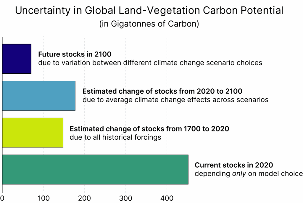 Moreover, while uncertainties in how the land responds to climate change — including feedbacks involving drought, temperature, pests, or tipping points — may be comparatively smaller than those of the baseline carbon stocks, they remain significant and poorly understood. These “known unknowns” compound the risks associated with overreliance on land-based mitigation. Land-based strategies such as afforestation are particularly sensitive, as their effectiveness depends not only on future environmental conditions, but also on the uncertain magnitude of existing carbon stored in vegetation and soils.