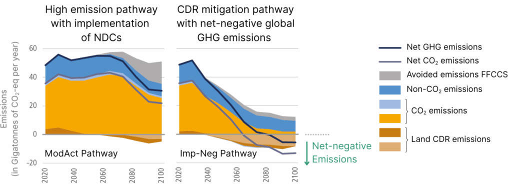 Potential role of land CDR for reaching net-negative emissions. Comparison of two illustrative high-emission and high-mitigation pathways, respectively: the Moderate Action Pathway (ModAct), leading to an increase in global mean temperature of more than 2°C, explores the impact of implementing the Nationally Determined Contributions (NDCs) as formulated in 2020 and some further strengthening after that (including Fossil Fuel Carbon Capture and Storage, FFCCS); and the Illustrative Mitigation Pathway with deployment of carbon dioxide removal that results in net negative global GHG emissions (Imp-Neg), which is consistent with meeting the long-term temperature goals of the Paris Agreement. (Figure adapted from Figure 3.7 WGIII of IPCC AR612).