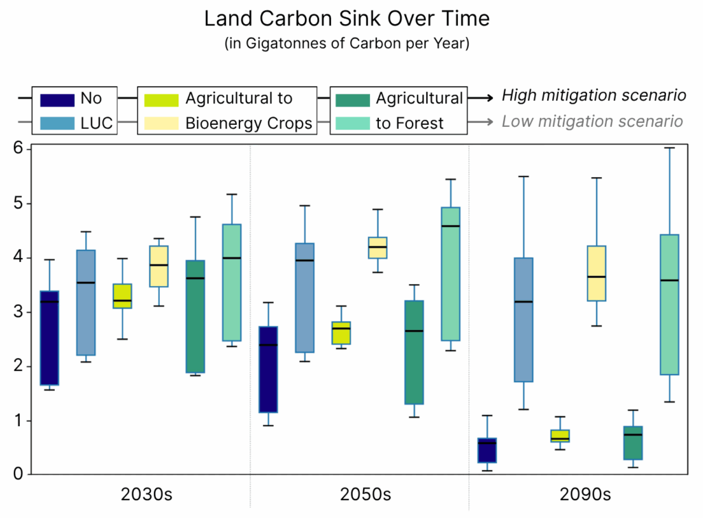 Simulated land carbon sink over time (in the 2030s, the 2050s and the 2090s), with “No LUC”: no land-use change (no land CDR implementation), with “Agricultural to Bioenergy crops” (conversion of agricultural lands to bioenergy crops), and with “Agricultural to Forest” (conversion of agricultural lands to forests); considering both high (SSP1-2.6) and low (SSP3-7.0) mitigation scenarios. Note: The No LUC and “Agricultural to Forest” bars include results from JSBACH, CLM, and ORCHIDEE land surface models; while the “Agricultural to Bioenergy Crops” bars include results from JSBACH and CLM only.