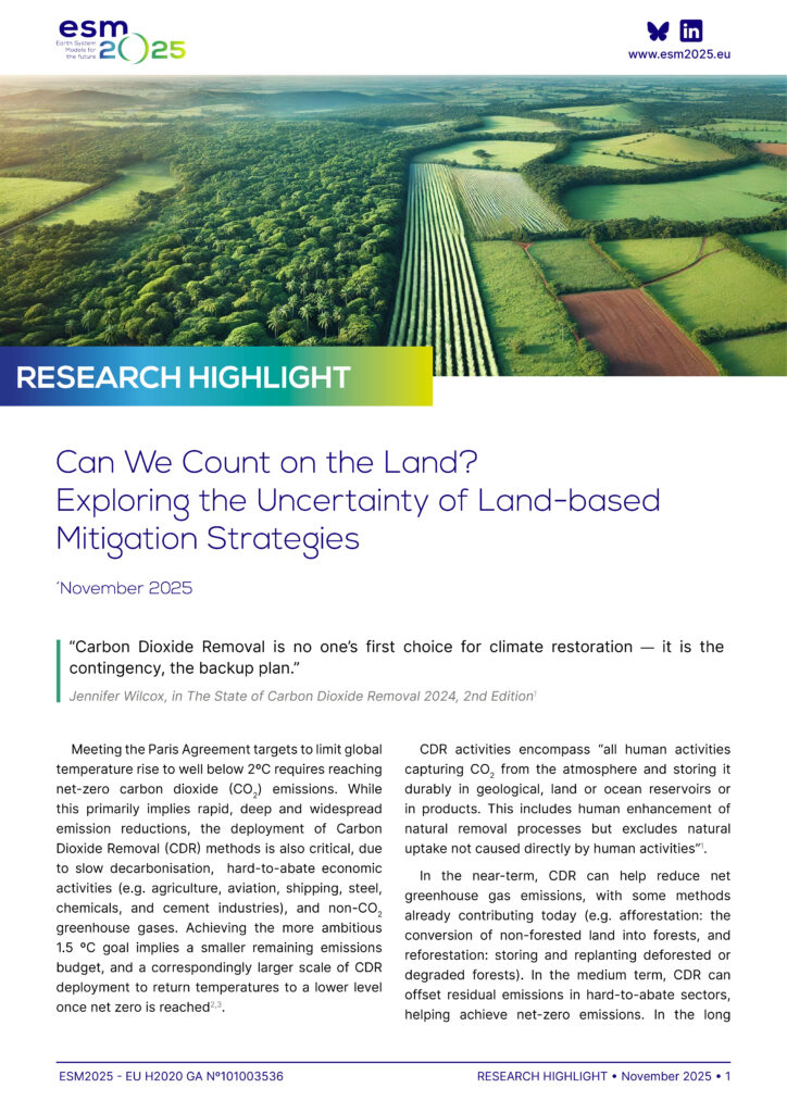This research represents a significant advance in our understanding of how land-based carbon dioxide removal strategies interact with the Earth system and their potential socio-economic impacts. A major strength of ESM2025 was its consistent use of up to four different land models per scenario, leveraging model diversity to explore how structural differences affect outcomes. This multimodel setup, rarely applied so systematically to land-based mitigation, provided new insights into carbon stock uncertainties, marking one of the projectʼs most innovative contributions.