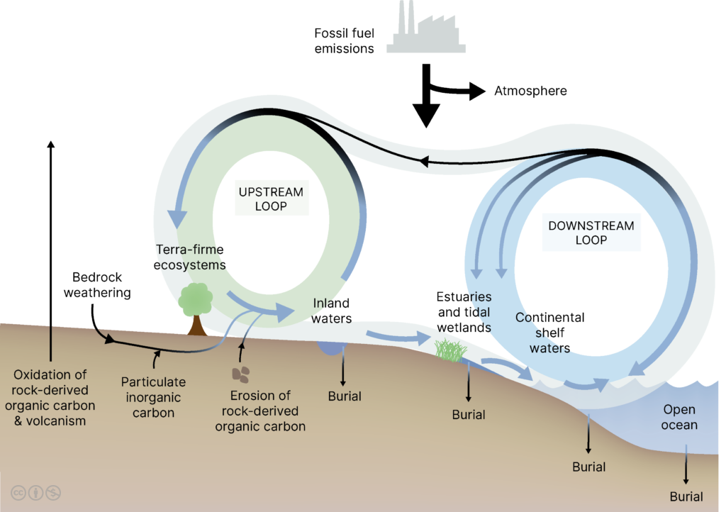 Traditionally, conceptual models of the carbon cycle quantified carbon storage by the ocean and the land separately, with terra-firme (dry-land) ecosystems on land and the open ocean “viewed as silos that exchange CO2 only with the overlying atmosphere”. This view was also reflected in many state-of-the-art Earth System Models that do not account for the direct exchanges of carbon between land and ocean. Furthermore, when included in traditional views of the carbon cycle, the lateral exchanges between these two reservoirs were represented by the river pipeline model, which assumes a direct and passive flow of natural carbon from land to the open ocean.