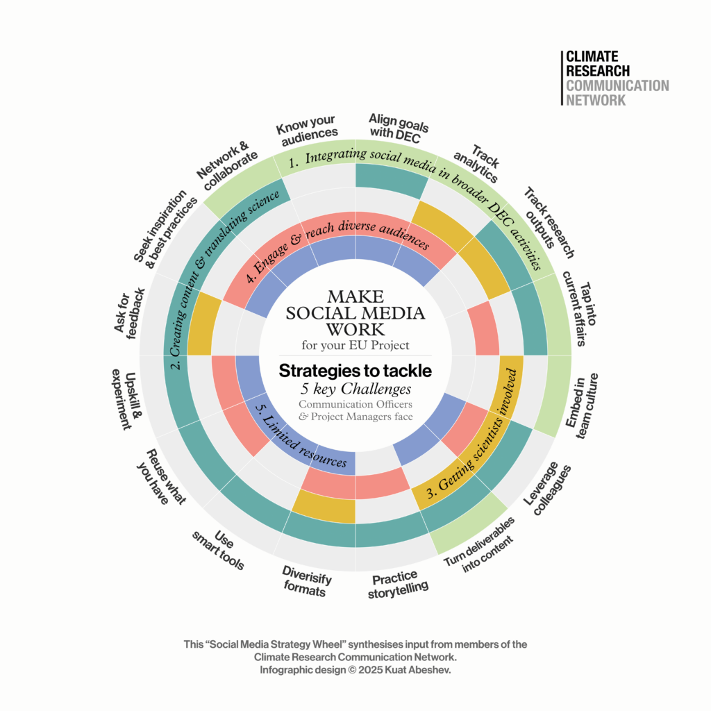 The wheel below, “Make social media Work for your EU Project”, summarises the key outcomes of this session. It presents a summary of various strategies to tackle 5 key challenges faced by Communication Officers and Project Managers when using social media as part of EU research project’s communication strategies.